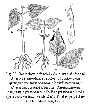 Simptome. Boala se manifesta in tot cursul perioadei de vegetatie, incepand cu aparitia cotiledoanelor pe care se observa pete circulare sau neregulate ca forma, brune-galbui, cu aspect apos pe vreme umeda. Pe frunze apar pete mici, de 2-3 mm, colturoase, delimitate de nervuri, translucide, verzi-galbui, acoperite cu exudat bacterian galben-vascos, vizibil pe fata inferioara a limbului. In conditii optime de temperatura (26-28oC) si umiditate atmosferica ridicata, numarul si suprafata petelor creste, ele conflueaza si halourile clorotice ajung la 2-5 mm latime. Daca umiditatea atmosferica scade, tesuturile se necrozeaza iar exudatul bacterian devine o pelicula fina, lucioasa ce se fragmenteaza usor. Tulpinile atacate au pete brun-roscate cu exudat galbui iar pe pastai, atacul se manifesta sub forma de pete mici, circulare, verzi-inchis, apoi brune cu o margine rosie-caramizie. Infectarea boabelor din pastai se face prin intermediul vaselor conducatoare sau prin micropil, iar ca urmare boabele raman mici, zbarcite; in cazul infectiilor tarzii, boabele au tegumentul ingalbenit sau numai o pata galbena langa hil (fig. 38).