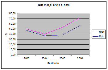 In primii 2 ani de analiza rata profitabilitatii comerciale a inregistrat valori care se situeaza sub valoarea recomandata. De asemenea indicatorul a inregistrat o tendinta de crestere in anul 2005 si 2006 comparativ cu 2003 si 2004, cu toate ca in ultimul an al analizei a crescut usor fata de anul precedent. Acest fapt se datoreaza unui ritm de crestere al rezultatului brut care depaseste ritmul de crestere al cifrei de afaceri. Pentru imbunatatirea indicatorului a fost necesar ca societatea sa-si optimizeze cheltuielile, sa accelereze viteza de rotatie a stocurilor, o alta cale fiind cresterea preturilor. Valorile inregistrate de indicator scot in evidenta o politica de pret care avantajeaza societatea, tarifele practicate pentru servicii aducand beneficiu societatii.