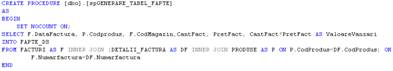 crearea tabelului FAPTE_DS. In acest sens am utilizat o procedura stocata, asa cum arata fereastra urmatoare: