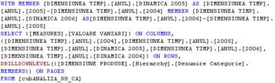 Modelul de analiza este implementat in EXCEL, iar datele sunt extrase din depozitul de date. Cu ajutorul interogarii de mai jos, din depozitul de date sunt preluate valorile necesare aplicarii modelului (atat indicatorii de baza - cifra de afaceri, productia exercitiului etc., precum si factorii de influenta, cei patru factori de influenta derivati fiind extrasi cu ajutorul unor membri calculati):