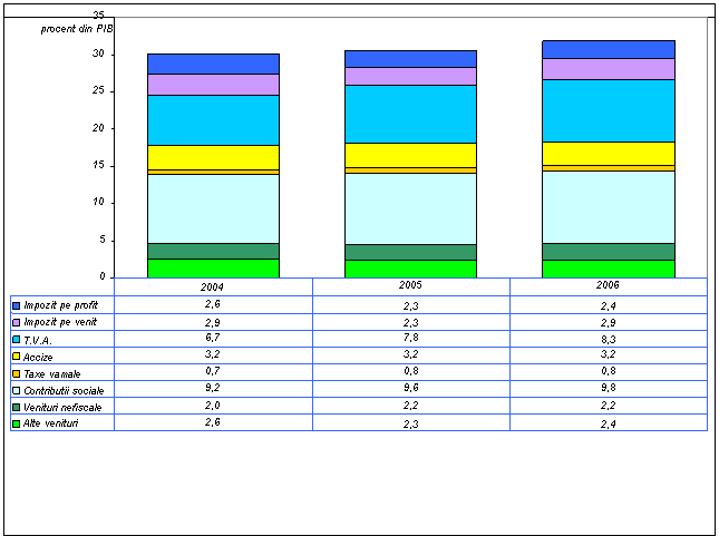 Este de remarcat faptul ca fata de anul 2004 (cand s-a aplicat legislatia anterioara reformei fiscale prin care, incepand cu anul 2005 s-a introdus cota unica de impozitare de 16%), incasarile la impozitul pe venit au crescut cu 37,1%, ajungand la acelasi nivel de 2,9 puncte procentuale ca pondere in produsul intern brut (graficul nr.1).