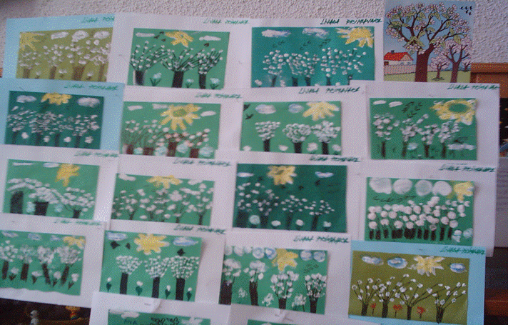 Se va prezenta modul de lucru. Veti desena cu carioca maron sau neagra trunchiurile copacilor, dupa care veti muia degetelul in pasta de dinti si veti face florile albe ale copacilor. Veti completa desenul cu alte elemente specifice primaverii: soare, nori. La sfarsit, cu varful pensonului muiat in galben puteti sa colorati soarele ca sa nu ramana alb. Norii ii puteti lasa albi sau dati cu acuarela albastra pentru a avea culoarea dorita. Daca veti mai avea timp, puteti completa cu alte elemente specifice primaverii: pasari, flori. Veti face la sfartit o expozitie iar eu voi arata copacelului ca dorinta lui s-a implinit si cat de frumos ati lucrat. Exercitii de incalzire a muschilor mici ai mainilor: -inchidem si deschidem pumnii; -cantam la pian; -ploua linistit, tuna, fulgera. Se atrage atentia sa lucreze corect, sa nu puna prea multa pasta de dinti, sa nu stearga ca sa nu se albeasca desenul. |