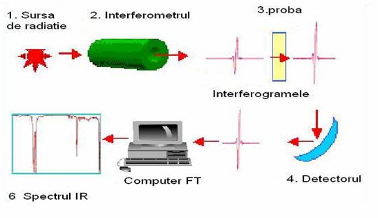 Interferometrul utilizeaza un separator de radiatie (beam spliter) care desface radiatia incidenta in doua. Una din ele este refelctata de o oglinda plana fixa iar cealalta este refelctata deasemenea de o oglinda plana care insa se misca pe o distanta de cativa mm fata de cealalta. Cele doua radiatii reflectate de oglinzile respective se recombina rezultand o interferograma. Aceasta are codate toate frecventele radiatiei incidente. Interferograma poate fi reflectata sau absorbita de proba cand frecventele caracteristice, continute codat in interferograma, sunt absorbite de vibratiile caracteristice grupului functional al moleculei din proba. Rezulta astfel un semnal in IR caracteristic, unic pentru proba respectiva. Acest semnal este masurat de detector, dar el nu poate fi prelucrat direct ci este necesara decodarea lui prin aplicarea tehnicii matematice cunoscuta ca Transformarea Fourier (FT). Aceasta decodare necesitand calcule laborioase se realizeaza cu ajutorul computerului rezultand in final un specru normal.