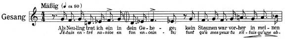 Partitura vocala prezinta, in ansamblu, o scriitura cromatica cu o intonatie apropiata vorbirii, marcata de momentul semnificativ al poemului: "stralucirea unui alt stapan ma atrage"( in andrer Herren prächtiges Gebiet). Aceasta evolueaza pe structura intervalelor asemanatoare unor mici arpegii frante, pe o dinamica crescendo, apoi descrescendo, (mas.7 - 10):