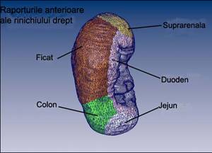 Fata ventrala a rinichiului drept este acoperita in buna parte de flexura dreapta a colonului. Deasupra acestei flexuri, rinichiul este in raport cu lobul drept al ficatului. Inferior de flexura, partea descendenta a duodenului acopera muchia mediala a rinichiului drept. Partea laterala, de sub flexura colica dreapta, este acoperita de colonul ascendent. Intre colon si duoden, extremitatea inferioara a rinichiului drept proemina de obicei in firida colica dreapta, acoperita de peritoneul parietal. De multe ori insa extremitatea inferioara nu apare in firida colica dreapta, fiind acoperita de colonul ascendent.