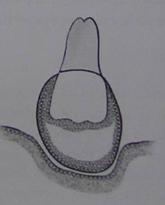 Fig.22 Prezentare schematica a formarii unui chist de eruptie in cazul molarului trei mandibular semiinclus. a)Infectia b) Inghesuirea si afectarea dintelui vecin c)Chist de eruptie.