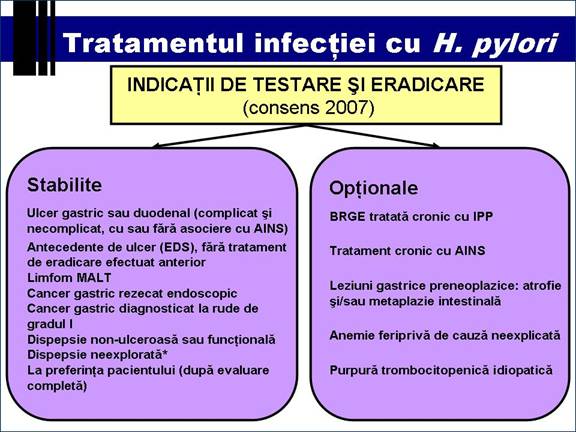Indicatii de tratament a infectiei cu H. pylori