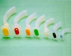 a) CANULA OROFARINGIANA este un tub curbat din material plastic ce se introduce in cavitatea bucala a pacientului, intre limba si palatul dur. Canula este prevazuta la extremitatea sa orala cu o margine mai dilatata pentru a impiedica alunecarea acesteia in cavitatea bucala. Are rolul de a ridica limba de pe peretele posterior al faringelui mentinand deschise caile aeriene. Canula orofaringiana permite aspirarea secretiilor din orofaringe cu ajutorul sondei flexibile introdusa prin orificiul central al pipei Guedel sau canalele laterale ale pipei Berman.Exista o gama larga de dimensiuni, de la cele pentru nou-nascut pana la cele pentru adult. Dimensiunea corecta a canulei este egala cu distanta dintre comisura bucala si unghiul mandibulei de aceeasi parte