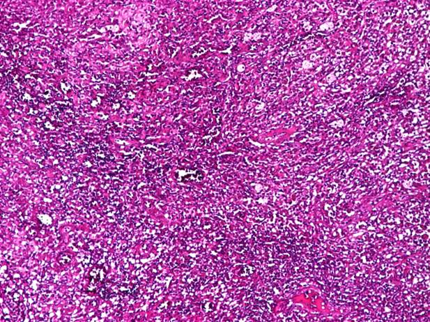 MO - necroza, degenerescenta + colostaza, inflamatie, regenerare; caracteristica este dezorganizarea trabeculelor hepatice, dar cu pastrarea arhitecturii lobulare normale. Aspectul corespunde unui polimorfism lezional "pestrit" , datorat hipercelularitatii si polimorfismului celular: