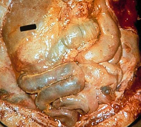 S Peritonita sero-hemoragica - MACRO - luciul si transparenta pierdute, hiperemie accentuata, sufuziuni sanguine, rare depozite de fibrinp; MO - vasodilatatie, infiltrat hemoragic inflam redusa cu PMN-uri