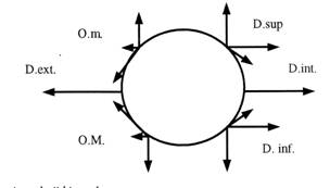 Muschii oblici au de asemenea o tripla actiune, deoarece directia muschilor formeaza cu axul vizual un unghi de 51 de grade(deschis posterior). In plus, actiunea muschilor oblici este explicata si prin insertia lor sclerala, situata posterior de ecuatorul globului ocular. Muschiul oblic mare este coborator, abductor si rotator intern, iar oblicul mic este ridicator, abductor si rotator extern (Fig.2).