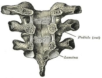 2. Pediculii sunt orientati spre lateral si sunt atasati de corpul vertebral la jumatatea distantei dintre marginile superioare, respectiv inferioare, astfel incat impresiunea vertebrei superioare sa fie la fel de adanca ca a celei inferioare.