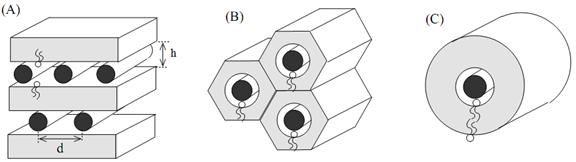Figura 4. Ilustrarea celor trei geometrii principale ale lipoplexilor. (A) structura "sandwich"; (B) structura "fagure de miere"; (C) structura "spachete", [dupa S. May, A. B. Shaul, 2004