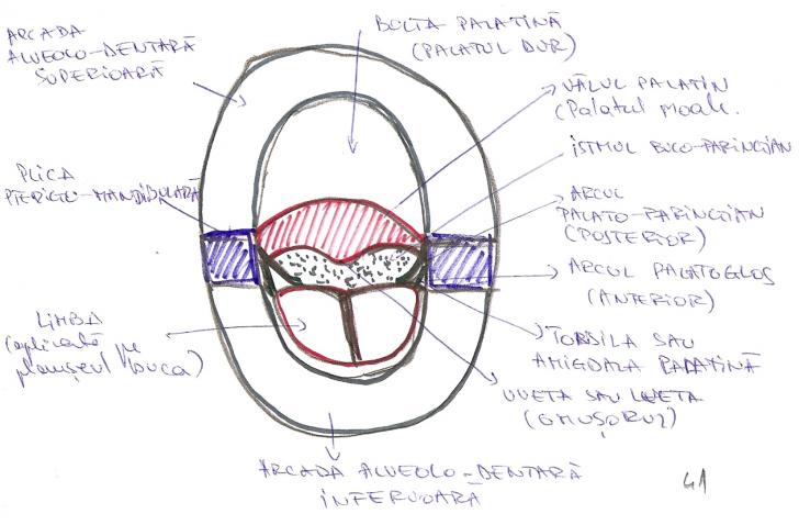 Istmul buco-faringian este delimitat superior de valul palatin, inferior de radacina limbii si lateral de arcurile palato-glos si palato- faringian.