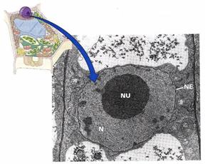 Fig. 13 - Imagine electron microscopica a nucleului celular (N) la celule de Vicia faba L., evidentiind membrana nucleara dubla (NE) si nucleolul situat central (NU) (d. Buchanan si colab., 2000) |