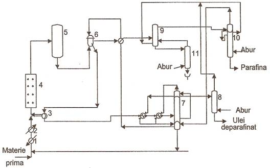 Schema tehnologica a instalatiei de deparafinare a uleiurilor cu MEC+T prin procedeul conventional este prezentata in figura 1.7., iar valorile uzuale ale principalilor parametri tehnologici sunt prezentati in literatura [1,2].