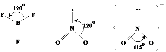Geometria trigonala Este prezenta in molecule ca BF3, NO2 si in ionul NO2-. In cazul azotului (cu 5 electroni pe utimul strat) exista aici si electroni neparticipanti (Fig. 3.16).