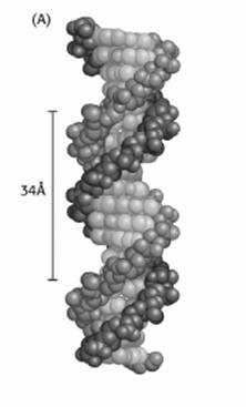 Diametrul elicei este de 20 Å, cu o perioada de identitate de 34 Å. Cele doua policatene sunt rasucite orientativ spre dreapta, o spira avand cate 10 nucleotide.