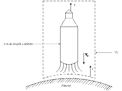 Consideram volumul de control de forma unui cilindru, care se extinde de la pamant pana mult in fata rachetei. Volumul de control va contine racheta, combustibilul si tot materialul evacuat. Impulsul sistemului format din racheta, combustibilul si materialul evacuat ramane constant, in conditiile in care nu exista forta exterioara care actioneaza asupra volumului de control:
