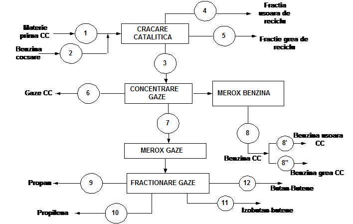 Procesul de cracare catalitica a distilatelor medii si grele are la baza reactii de cracare, in urma carora se realizeaza descompunerea materiilor prime cu obtinere de fractii usoare metan - butan, benzine si motorine. Procesul are loc in prezenta de catalizatori zeolitici in strat fluidizat. Amestecul de reactie este supus unui proces de fractionare, in urma caruia se obtin produsele finite.