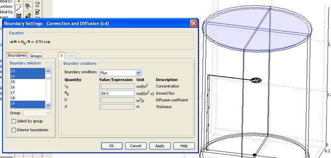 -urmeaza selectia suprafetei care reprezinta suprafata substantei de evaporat si setarea conditiei urmarite.Se poate alege in cazul nostru Concentration sau Flux, diferenta intre ele este ca se va prezenta in modul de Postprocessing distributia de concentratie, respectiv de flux.Noi am facut solve pentru amandoua dar se prezinta doar penru Concentration.