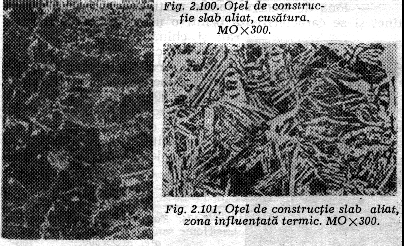 Cercetarea metalografica a imbinarilor sudate in OL 37 ( sudata electric, manual ) evidentiaza o structura grosolana cu cristale columnare orientate in directia evacuarii caldurii ( figura 3. ), o structura mai fina cu cristale ce tind sa aiba forma globulara-formatiuni trostitice ( figura 4. ), o structura ferito-perlitica a materialului de baza ( figura 5. ). Structura unei imbinari din otel aliat ( 0,17% C; 0,1% V; 1,32% Mn; 0,39% Si ) prezinta o cusatura formata din cristale columnare orientate perpendicular pe sanfrenul tablei ( figura 6. ), in zona influentata termic, tendinta de formare a structurii Widmannstätten si de globularizare a grauntilor ( figura 7. ), iar materialul de baza are o structura ferito-perlitica. Zona de trecere nu este clar evidentiata.