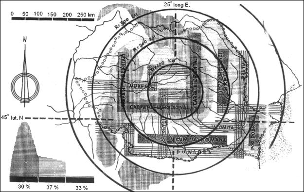 Fig. 290. Axele ortogonale si ariile circulare concentrice ale cadrului natural (dupa G. Gusti, 1974).