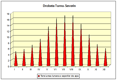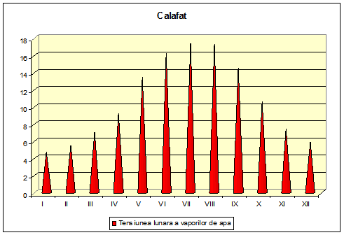 Tensiunea lunara a vaporilor de apa creste din luna ianuarie, luna cu cele mai mici valori, pana in luna iulie dupa care tensiunea scade.