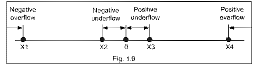 Legat de standardul IEEE 754, asupra caruia se va reveni in amanunt in capitolul 5, mai mentionam ca el permite semnalarea a patru situatii exceptie pentru a caror codificare se folosesc valorile limita ale exponentului, neutilizate pentru numere ordinare, adica 0 si 225 la formatul pe 32 biti, respectiv 0 si 2047 la formatul pe 64 biti. Astfel atunci cand in calitate de rezultate, intermediare sau finale, nu se obtin numere de virgula flotanta valide-cum ar fi, spre exemplu rezultatul unei impartiri, la 0-avem de-a face cu situatia exceptie: NaN(de la Not a Number). La sesizarea unei asemenea anomali, campul de exponent este setat la valoarea 255 la formatul pe 32 biti, respectiv la valoarea 2047 la formatul pe 64 biti, iar campul de mantisa poate avea orice valoare, dar diferita de 0. Daca insa, unul dintre rezultate apartin uneia dintre zonele de overflow (fig.1.9), atunci campul de exponent este setat la acelasi valori de mai sus, dar campul de mantisa este adus la zero. Cea de a treia exceptie corespunde situatiei cand un rezultat apartine uneia dintre zonele de underflow (fig.1.9). In acest caz, campul de exponent este setat pe 0 pentru ambele formate, iar campul de mantisa poate lua orice valoare diferita de zero. Rezultatul este codificat prin asa numita forma denormalizata [ScST05] a carei caracteristica este reducerea efectului underflow-ului printr-o sistematica pierdere de precizie. Un numar X in forma denormalizata pe 32 biti este data de: