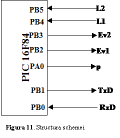 Proiectarea elementelor electronice ale sistemului o vom face utilizand circuitul AT89C2051, care este dotat cu 2 Ko memorie EEPROM (Flash) care permite stocarea programelor de comanda si control. Sunt necesare atat amplificatoarele in comutatie pentru comanda electrovalvelor si a pompei de presiune cat si circuitele de intrare ce se prezinta sub forma unor trigger-e Schmidt, pentru formarea semnalelor de la limitatoarele 1 si 2. Structura gandita este prezentata in figura 2.