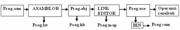Asamblorul prelucreaza un fisier text sursa (Prog.asm), scris cu un editor de texte si genereaza un modul obiect (Prog.obj) care contine instructiuni si date ce sunt plasate de la adresa 000. Dupa etapa de asamblare se genereaza si un fisier lista care contine comentarii asupra programului. Utilizand directiva include se copiaza in programul curent si alte programe eventual librarii la care se face referire. Modulele obiect nu sunt executabile dar pot fi depuse in biblioteci (Bibl.lib).