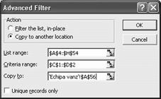 Dupa definirea zonei de criterii, efectuam clic stanga in interiorul listei si deschidem fereastra Filtrare complexa (Advanced filter). De data aceasta deoarece se doreste extragerea liniilor filtrate dintr-o zona separata de lista, bifam butonul radio Copiere in alta locatie (Copy to another location). Se activeaza si cea de-a treia caseta din fereastra, cea care se refera la zona unde vor fi extrase liniile rezultate prin filtrare.