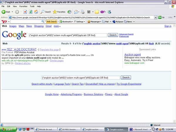 In acest proiect am incercat aplicarea mai multor tehnici de cautare pentru a gasi informatii utile despre Aplicatii ale licitatiei englzezesti in sistemele multi-agent. Exista mai multe motoare de cautare si anume :
