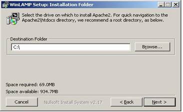 Pas 2. Se Selecteaza discul si folderul in care se instaleaza serverul Web Apache2, recomandat ar fi direct in radacina.