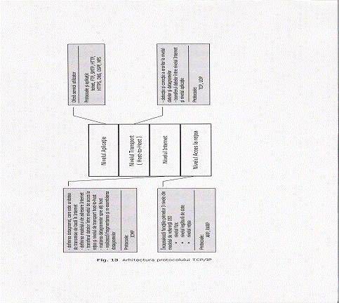 Familia de protocoale TCP/IP are o parte stabila, data de nivelul Internet (retea) si nivelul transport, si o parte mai putin stabila, nivelul aplicatie, deoarece aplicatiile standard se diversifica mereu. In ceea ce priveste nivelul gazda-la-retea (echivalentul nivelul fizic si legatura de date din modelul OSI), cel mai de jos nivel din cele patru, acesta este mai putin dependent de TCP/IP si mai mult de driver-ele de retea si al placilor de retea. Acest nivel face ca functionarea nivelului imediat superior, nivelul Internet, sa nu depinda de reteaua fizica utilizata pentru comunicatii si de tipul legaturii de date. Protocoalele din familia TCP/IP trateaza toate retelele la fei. De aici rezulta un concept fundamental pentru retelele TCP/ IP, si anume acela ca, din punct de vedere al unei retele globale, orice sistem de comunicatii capabil sa transfere date conteaza ca o singura retea, indiferent de caracteristicile sale. Strategia de a construi nivelurile unui protocol se numeste layering. Toata reteaua TCP/IP (Internet-ul) este organizata dintr-un numar foarte mare de retele mici care comunica intre ele prin asa numitele porti (gateway), care sunt calculatoare ce se ocupa de interconectarea retelelor care vor iesi in Internet, una dintre atributiile lor fiind si aceea de a ruta informatia. TCP/IP este construit ca fiind o secventa de datagrame. o datagrama este o colectie de date ce sunt trimise ca un singur mesaj; este o unitate de date si reprezinHi obiectul cu care lucreaza protocolui.Un pachet este un cumul de datagrame, ce apare peEthernet,liniitelefonice saualtetipurideconexiunifizice. O comparatie intre modelul ISO /OSI si modelul TCP/IP, precum si protocoalele mai importante din suita de protocoale TCP/IP este evidentiata in figura urmatoare.