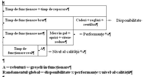Analizand figura de mai sus se poate observa ca randamentul global creste odata cu cresterea disponibilitatii, performantelor si nivelului calitatii echipamentului productiv. Prin cresterea disponibilitatii duratele intreruperilor in functionarea echipamentelor datorate caderilor, interventiilor, reparatiilor, reglarilor si reutilarilor scad semnificativ, prin imbunatatirea performantelor masinilor si utilajelor se reduc timpii neproductivi rezultati din mersul in gol, opriri sau viteze reduse, iar cresterea nivelurilor calitative ale echipamentelor determina timpi de functionare efectivi mari, numarul de rebuturi micsorandu-se.