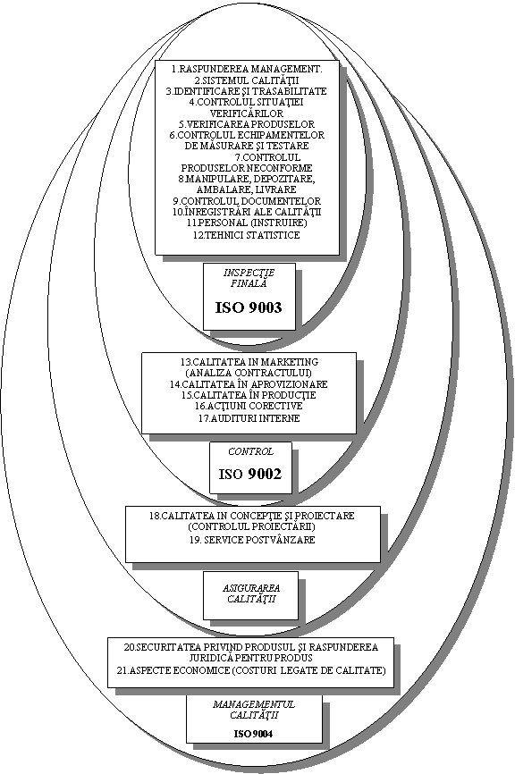 Din punctul de vedere al primului aspect, pe baza aderarii Institutului Roman de Standardizare la Comitetul European de Standardizare Electrotehnica, precum si la Reteaua Internationala de Terminologie, in tara noastra s-au adoptat normele din seria ISO 9000, seria EN 29000 si EN 4500, incluzandu-le in nomenclatorul de standarde romanesti. Un exemplu de adaptare a standardelor romanesti la prevederile ISO 9000 - 9004 este prezentat in Figura 3.2..