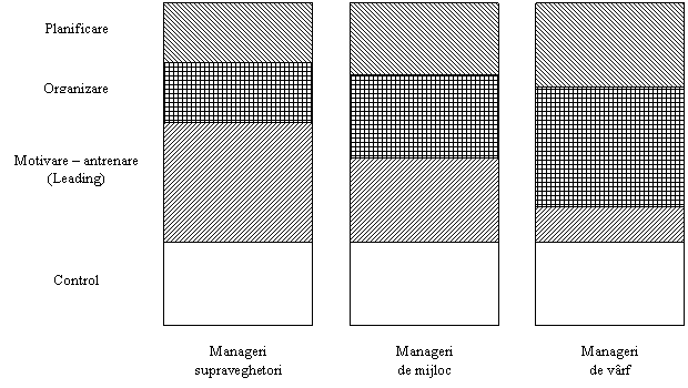In contrast cu aceste functii, leading-ul este substantial o functie mult mai importanta pentru supraveghetori decat pentru manageri aflati pe niveluri superioare. Deoarece managerii de comanda sau supraveghetorii sunt responsabili si insarcinati cu functionarea productiei de bunuri sau servicii, ei trebuie sa se angajeze in activitati substantiale si largi de comunicare, motivare, directionare si sprijinire. In sfarsit functia managementului care este cea mai asemanatoare sau similara ca volum pentru toate cele trei niveluri este controlul. Aceasta asemanare reflecta un grad sau nivel comun de accentuare la toate nivelurile a activitatilor de monitorizare si intreprinderea de actiuni corective ca necesare.