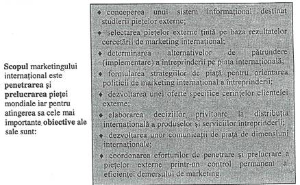 marketul international reprezinta o maniera de conducere a ctivitatii intreprinderii, de natura sa asigure realizarea indicatorilor acesteia de performanta pe tremen lung, prin penetrarea si prelucrarea pietelor esterne in accord cu resursele valorificabile de catre organizatie, inclusive de pe piata nationala.