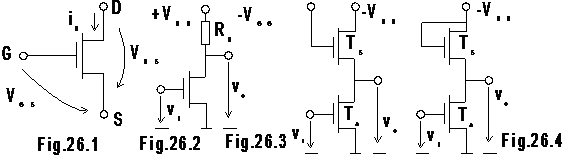 Cu tranzistoare cu efect de camp de tip MOS se pot realiza inversoare logice - ca circuite de baza pentru circuitele logice - in mai multe moduri, in functie de tipul rezistentei de sarcina; in lucrare, vor fi prezentate inversoarele din fig. 26.2, 3 si 4.