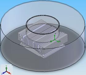 Pentru determinarea regimului termic al ansamblului procesor-radiator-ventilator s-a considerat domeniul cilindric prezentat in figura 18. Dimensiunile cilindrului care cuprinde ansamblul procesor-radiator-ventilator sunt: raza bazei 100 mm, inaltimea 67 mm.