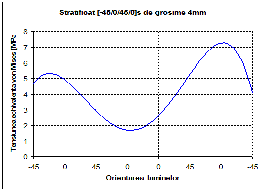 In figurile 35, 36, 37, 38 sunt prezentate distributiile tensiunilor echivalente Von-Mises pe fiecare lamina, in patru tipuri de configuratii diferite: [0/45/-45/0]S, [-45/0/45/0]S, [45/-45/02]S, [-45/02/45]S, pentru a se observa modul de comportare al stratificatului in functie de secventa de orientare a fibrelor in lamine.