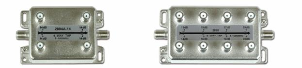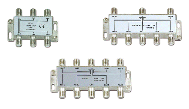 Similar este realizat distribuitorul de exterior cu 8 iesiri atenuate, care are valorile standardizate de 14dB, 17dB, 20dB, 23dB, 26dB si 29dB. Splitterul de exterior cu 8 iesiri atenuate cu cate 11dB este varianta terminala, fara iesire directa al acestui distribuitor.