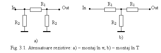 Atenuatoarele se construiesc sub forma de retele de atenuare pur rezistive in π sau in T (fig.3.1), in tehnologie SMD incapsulate in carcasa metalica, prevazute cu mufe F, de obicei una tata si una mama. Se utilizeaza retele pur rezistive si tehnologie SMD pentru a avea o atenuare strict constanta in toata gama de frecvente de lucru. Tehnologia SMD reduce mult valorile capacitatilor si inductivitatilor parazite proprii ale rezistentelor si ale montajului.