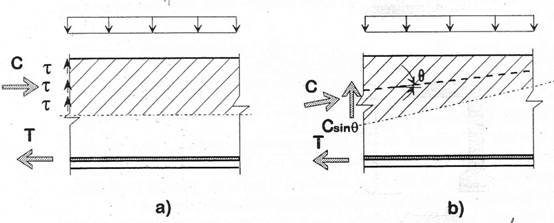 In cazul mecanismului de grinda incarcarile exterioare transversale se transmit la reazeme prin eforturi tangentiale (flg.1.49.a). In cazul mecanismului de arc fortele transversale sunt echilibrate prin componenta verticala a fortei din 'arcul' constituit in grosimea elementului (fig.1.49.b).