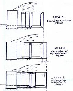 Faza 3. Se pun in functie presele de avans.Presele sunt impartite in mod egal pe circumferinta inelului erector,au axul paralel cu generatoarea scutului si cursa pistonului egala cu avansul (A) plus o rezerva (aprox. 250mm).Presele pot fi actionate toate odata,fiecare independent sau pe sectoare.Inelul erector are patru sectoare(jos,sus,stanga,dreapta).Aceste patru sectoare dau posibilitatea dirijarii scutului prin actionarea anumitor sectoare.Prin spijinirea erectorului pe inelul de boltari scutul este impins in golul format in faza 1, operatie numita avans.