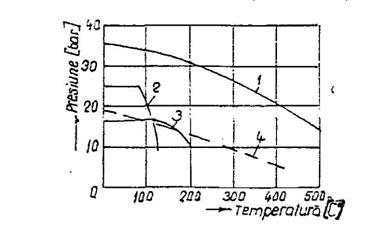 Fig. 1.9 Domeniul de utilizare presiune-temperatura la alegerea schimbatoarelor de caldura compacte: l-aparat lameiar; 2-aparat cu placi cu garnituri din cauciuc; 3-aparat cu placi cu garnituri din snur de fibra de azbest; 4-aparat spiral