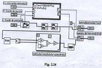 Sinteza semnalelor periodice este limitata in aceasta prima etapa la semnale cu doar trei armonici (primele trei). Se studiaza influenta acestor armonici in sinteza semnalului. Fereastra-panou care constituie interfata cu utilizatorul, va fi constituita din urmatoarele elemente: un ansamblu de 8 intrari numerice, care permit definirea coeficientilor k si c ai fundamentalei si ai celor trei armonici, precum si a unor iesiri grafice de tip osciloscop. Programul din fereastra-diagrama se realizeaza utilizand instrumentul grafic dezvoltat anterior. Pentru aceasta este suficient sa se introduca o structura respectiva de tip For (,,pentru") pentru crearea celor n puncte ale semnalului (Figura 2.9).