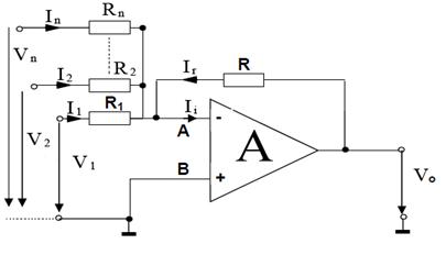Cand la intrarea inversoare se aplica mai multe tensiuni prin intermediul unor rezistente, la iesire se obtine un semnal in antifaza egal cu suma tensiunilor de la intrare