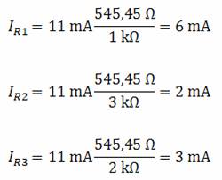 Stiind ca in circuitele paralele suma curentilor de pe fiecare ramura reprezinta curentul total, putem completa tabelul cu valoarea totala a curentului prin circuit, 11 mA.